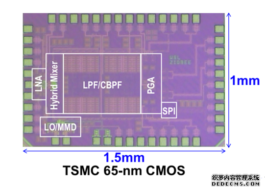 图为集成电路芯片照片,采用台积电TSMC 65-nm CMOS工艺流片,芯片面积仅仅为1.5mm2