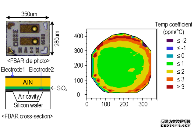 图为薄膜体声波谐振器芯片照片以及温度系数测试结果,芯片面积小于0.01mm2,