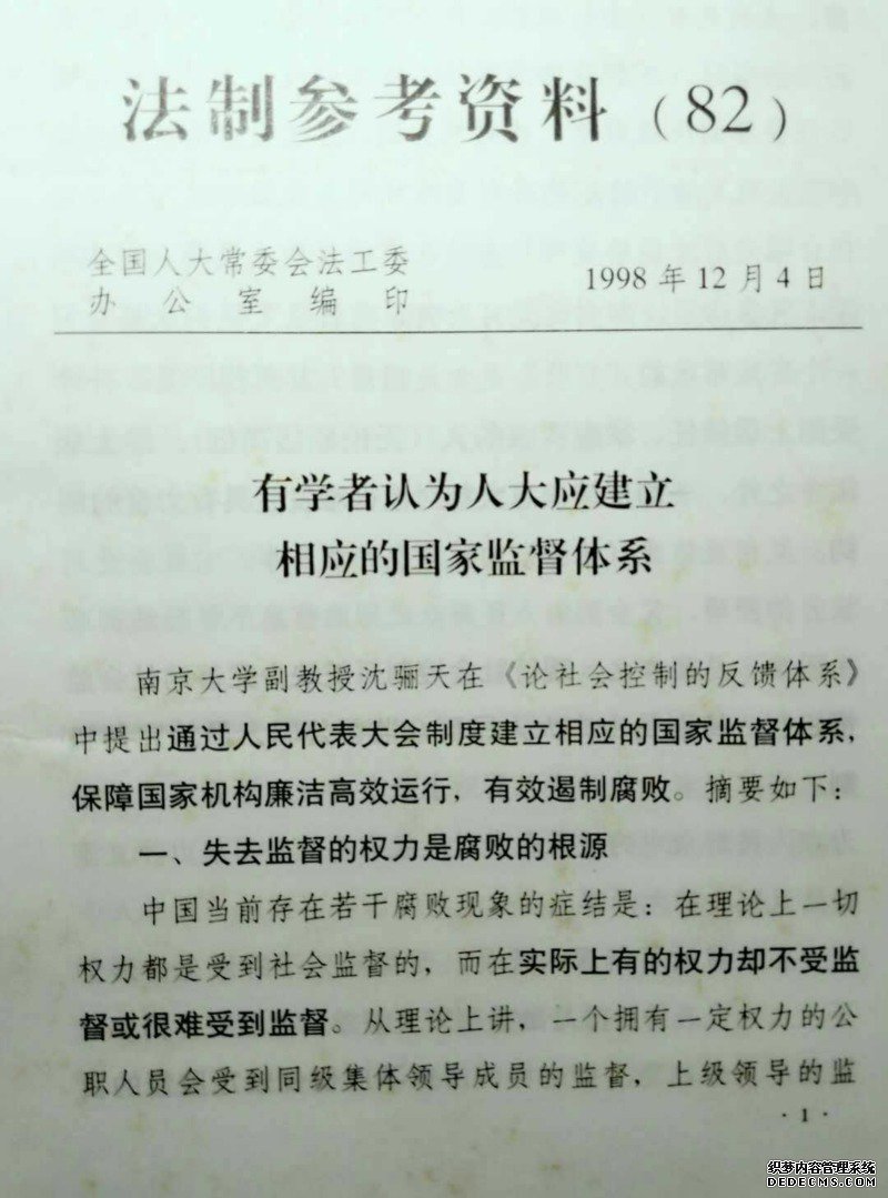 日前,国家监察制度改革作为十三届人大修宪议程中的重要内容引起社会广泛关注,引发热议。据了解,早在1998年,南京大学哲学系教师沈骊天便提出通过人民代表大会制度建立相应的国家监督体系,保障国家机构廉洁高效运行,有效遏制腐败。这一建议被收入《法治参考资料》并报送党中央和相关国家机关。